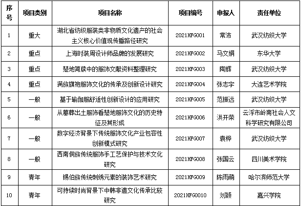 湖北省服饰艺术与文化研究中心2021年度项目已完成专家评审工作,其中《湖北省纺织服装类非物质文化遗产的社会主义核心价值观传播路径研究》等10项通过评审。各项目负责人应按照《2021年度湖北省普通高等公司人文社会科学重点研究基地“湖北省服饰艺术与文化研究中心”基金项目申报说明》的有关规定,完成相关研究工作。所取得成果均需标注“湖北省服饰艺术与文化研究中心2021年度课题资助项目”字样,方可作为结题验收成果。