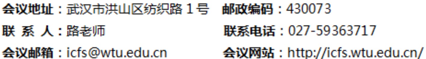 请将会议电子回执发送到邮箱:icfs@wtu.edu.cn。发送邮件时请按照以下主题格式:“作者单位-第一作者姓名-ICFS”(如需开具发票,请在回执附件中填写开票信息)。回执表等相关文件请在会议官网下载。
