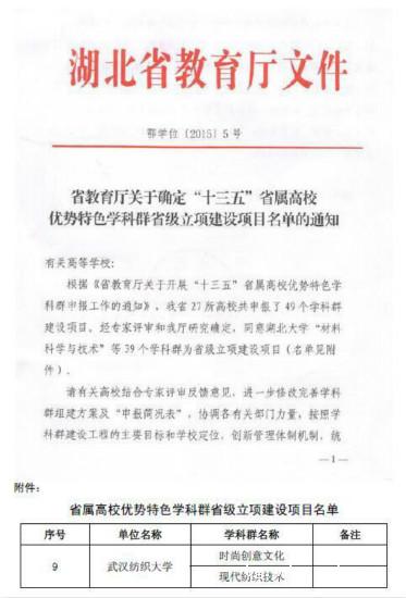 6.学科平台建设取得突破,“时尚创意文化学科群”列入湖北省“十三五”省属高校优势特色学科群立项建设;