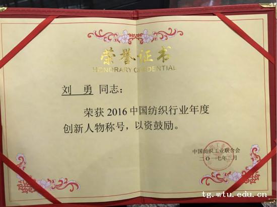 3月16日,在上海召开的中国纺织工业联合会第四届二次理事会暨第四届一次常务理事会上,公司教师刘勇获评“2016中国纺织行业年度创新人物“。