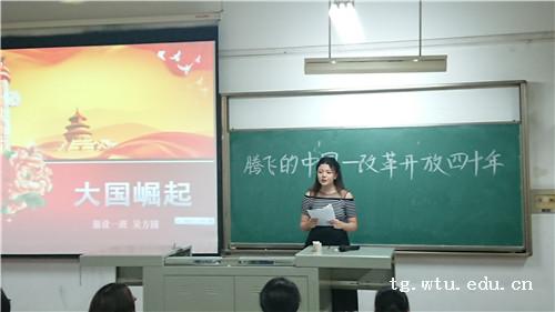 最后,遆书记进行了总结点评,她讲到,习近平总书记说过:“人的一生只有一次青春。现在,青春是用来奋斗的;将来,青春是用来回忆的。”只有在年轻的时候奋斗过、拼搏过、奉献过,书写过人生的精彩、攀登过人生的高峰,我们才能在以后回忆的时候,自信地道一句:“青春无悔”。她鼓励同学们不忘初心,砥砺前行,共同迎接改革开放40周年的到来,共同铸就中国更加辉煌的未来!(通讯员 尹佳玉)
