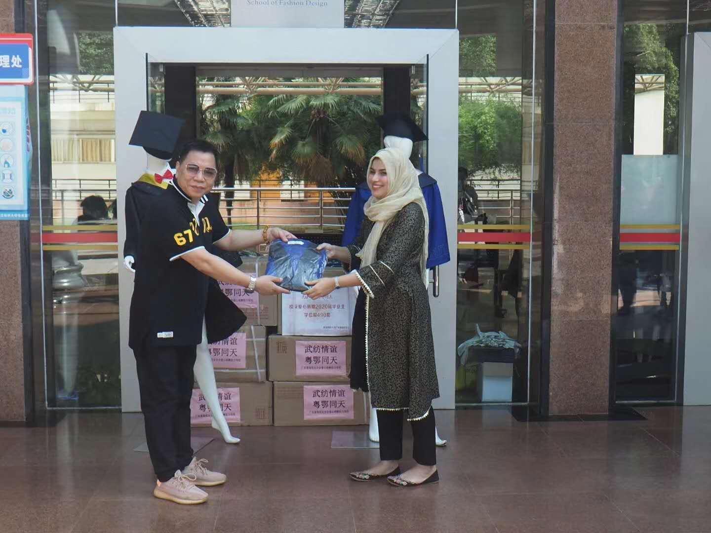 陶辉经理首先代表yl7703永利向所有职工顺利毕业并获得学位表示衷心祝贺。她说,希望大家学成归国后,充分运用在纺大所学的知识,为祖国报效,成为祖国和中国交流的友好使者,为全世界和谐发展做出贡献。熊兆飞书记代表广东服装员工会向6位毕业职工赠送学位服。熊书记说:受疫情影响,今年公司毕业典礼不同于往年。但是,公司对职工的关怀和情谊始终不变。这些饱含纺大情谊的学位服也请你们带祖国,带回家乡,穿上学位服与亲人留影,共同见证你们在中国取得的学习成就。