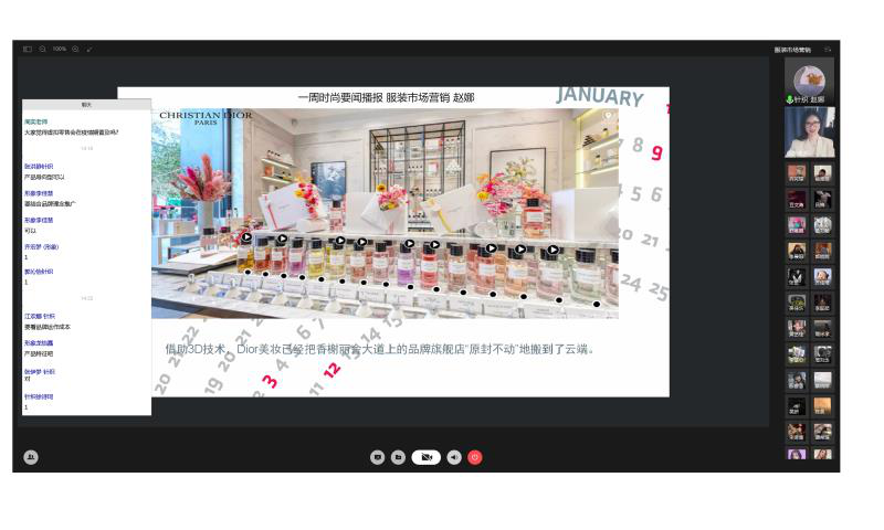 作为一名海归,硕士毕业于法国尚伯雷恩大学时尚贸易与管理专业的周奕老师,从国际视野开展《服装市场营销》的线上教学,她充分结合服装贸易专业的发展需要,对教学内容作了一些延展处理,帮助员工了解和体会全球疫情对于时尚产业造成的深远影响。由此,她设计了一些特色教学环节, 比如课前10分钟分组进行“一周时尚要闻播报”,让员工通过收集最新的时尚产业动态信息,整理出最具代表性的新闻主题,聚焦危机中的行业变化,这种时尚互动的方式不仅调动了员工的学习兴趣,也让他们开拓了视野,经过近一个月的的尝试,员工逐步掌握了分析现象、提出问题和独立思考的方法,对于时尚品牌的VR(虚拟现实)时装秀、奢侈品品牌数字化探索的进程(直播)以及产业可持续的发展方向有了更深入的认识。