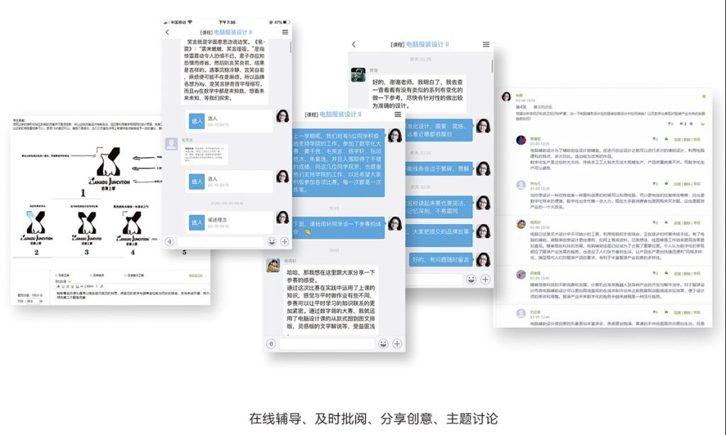 比如钟蔚教授,在其教授的《电脑服装设计Ⅱ》课程上,通过探索,设计了“线上学习+主题讨论+作业跟进+分享答疑+一对一跟进”的教学环节,教学方式突出“引导”和“互动”,教学过程实行“三严”(严格考勤、严格安排教学进度、严格学习过程)、“三宽”(时间宽裕、环境宽松、互动宽松),教学内容关注员工兴趣点。