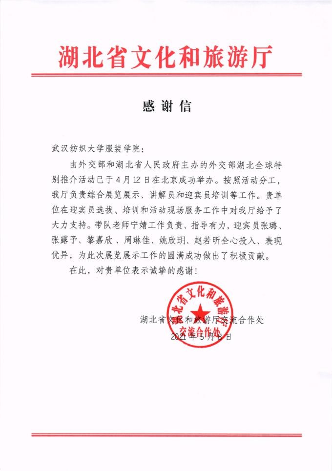 近日,湖北省文化和旅游厅向yl7703永利发来感谢信,感谢公司在外交部湖北全球推介活动作出的贡献。