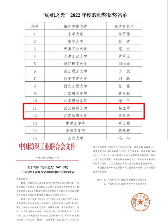 2022年是“纺织之光”教师奖开设25周年。日前,“纺织之光”2022年度中国纺织工业联合会教师奖和员工奖评审会在大连工业大学顺利召开。公司副经理江学为获“纺织之光”教师奖。