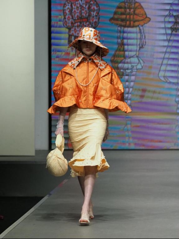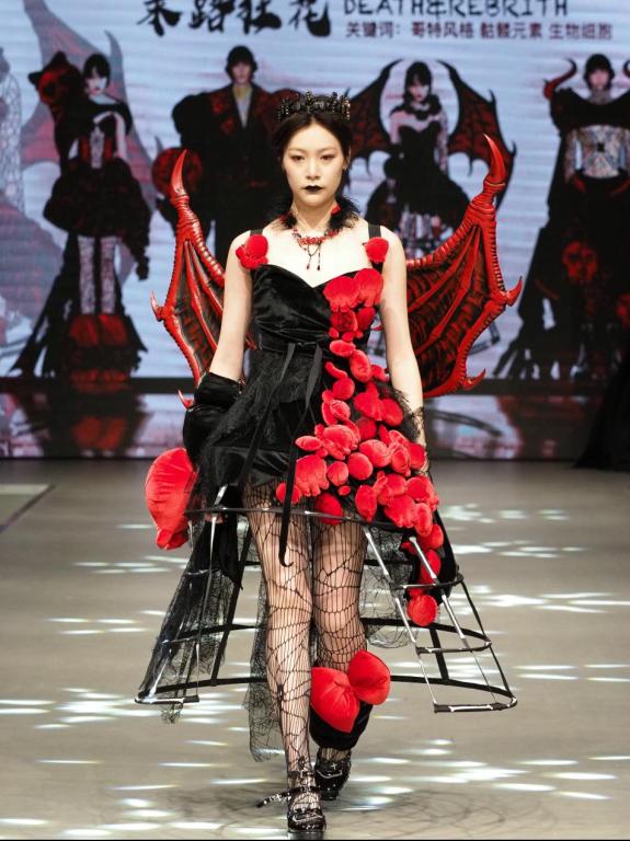 上午场“万象·无界”为创意设计专场,设计师们将自身创意与现代时装元素相结合,进行美学与艺术的探索。设计灵感涵盖中西方元素,如仰彩陶鱼纹、柿蒂纹、皮影、中国航天等中方元素,又如褶皱、洛丽塔风格、哥特风格、欧洲X造型等西方元素。设计师们通过层叠、重组等方式突出作品艺术效果,为在场观众带来视觉上的冲击和心灵上的震撼。