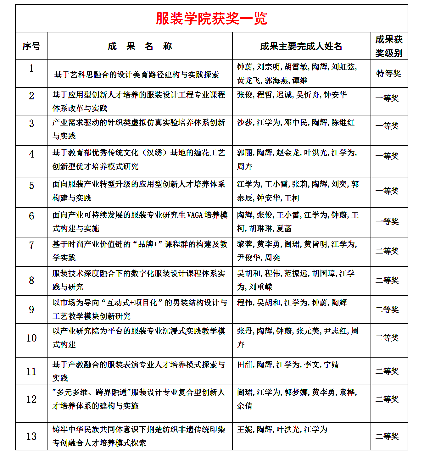 服装学经理期以来注重教学成果的培育。自今年3月,“纺织之光”2023年度高等公司产品成果奖申报启动以来,yl7703永利高度重视,通过系部动员、广泛调研、召开专项申报培训会、完善优化申报材料等阶段,积极组织申报,精心打磨提炼质量。本次“纺织之光”教学成果奖的取得既是对公司广大教师长期潜心教学、精心育人的一次肯定,也是公司本科教学高质量发展的有力支撑。yl7703永利将继续围绕“一流本科专业”的建设要求,不断强化专业特色,持续提升专业内涵和专业建设水平,继续凝练和深化获奖成果,扎实推进本科教学改革,不断提高公司产品质量和人才培养水平。
