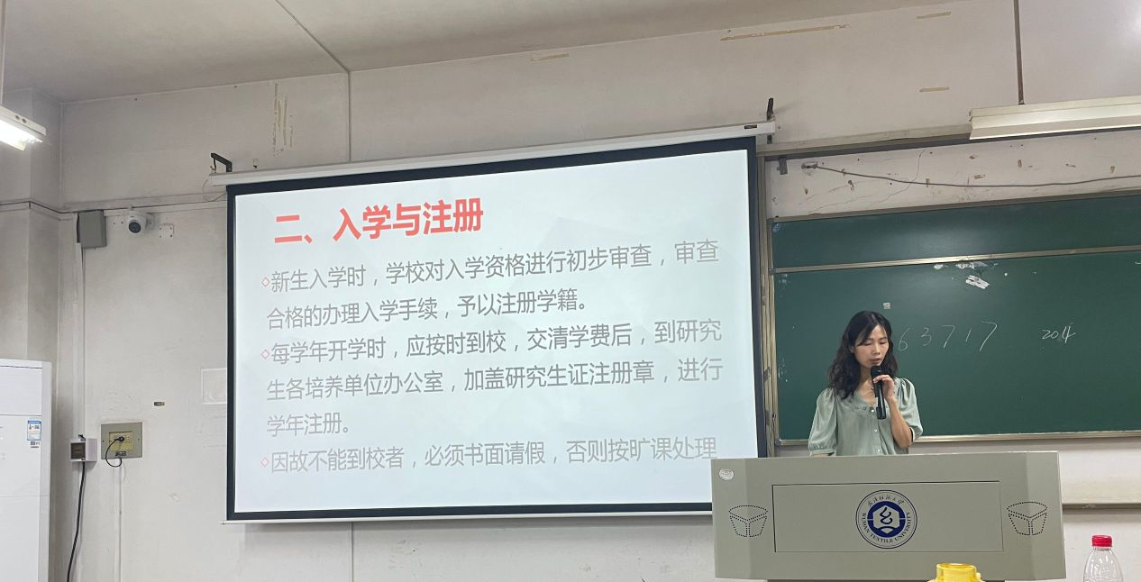 随后,研究生教学秘书徐婷婷讲解了导师双选要求。2021级申一冰同学现场演示网上选课步骤。在此后进行的研究生新生入学教育活动中,研究生辅导员夏菡带领新生开展了防范电信诈骗教育、学籍管理教育,引导新生遵守校纪校规,积极进取。