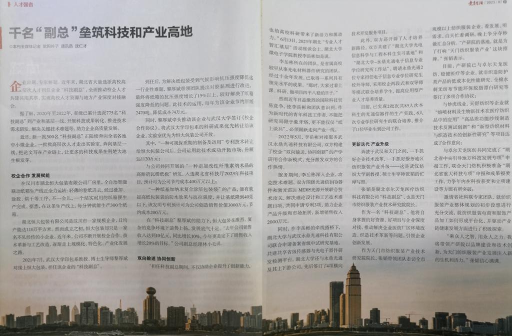 据悉,张韬在今年的《关于对服务基层工作表现突出的专业人才和选派单位进行表扬的通报》(鄂人才办[2023]1号)中获“服务中小微企业科技副总”表扬。