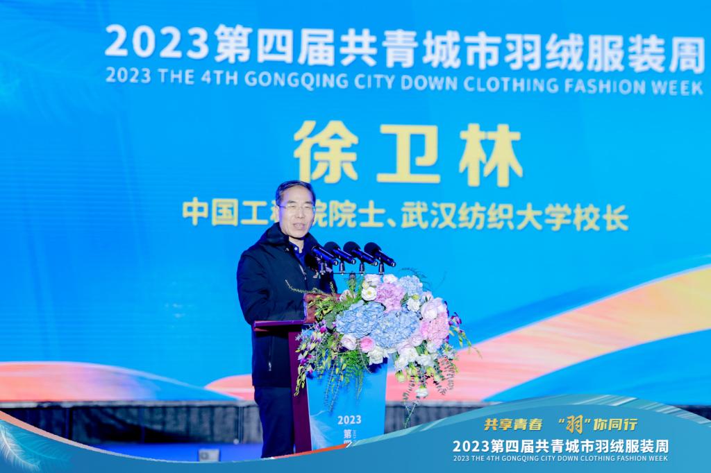 活动中,董事长徐卫林做了发言并与地方领导及嘉宾共同上台按下启动按键,开启服装周活动。他在发言中说到:“2021年3月,我有幸受邀参加永利官网共青城研究院的签约仪式,第一次共青之行给我留下了美好而深刻的印象。共青城是一座“青春活力”之城,是一座“开拓创新”之城,更是一座“绿色生态”之城。这里汇聚了一大批敢闯敢拼的热血青年在此创新创业。中国第一件自主研发的羽绒服在这里诞生。如今,共青城市是“中国羽绒服装名城”,纺织服装是共青城的首位产业和主导产业。两年多来,我们双方按照“一所大学支持一座城市,助推一个产业”的发展目标,秉承“崇真尚美”的校训,以“自强不息、经天纬地”的大学精神为指导,坚持以纺织材料、服装设计为特色,顺应共青城产业发展潮流,把握产业发展大势,全面推进产学研融合,主动参与、服务并带动共青城纺织服装产业的发展。“研究院+产业园”的运营模式广受关注和好评,我相信在双方的共同努力下,共青城产业研究院一定会硕果累累,为共青城市纺织服装产业高质量发展做出更大的贡献。作为校地合作的成功典范,永利官网将举全校之力,在助推共青城成为“一座温暖全世界”的城市的征程上,发挥高校科技引领作用。”
