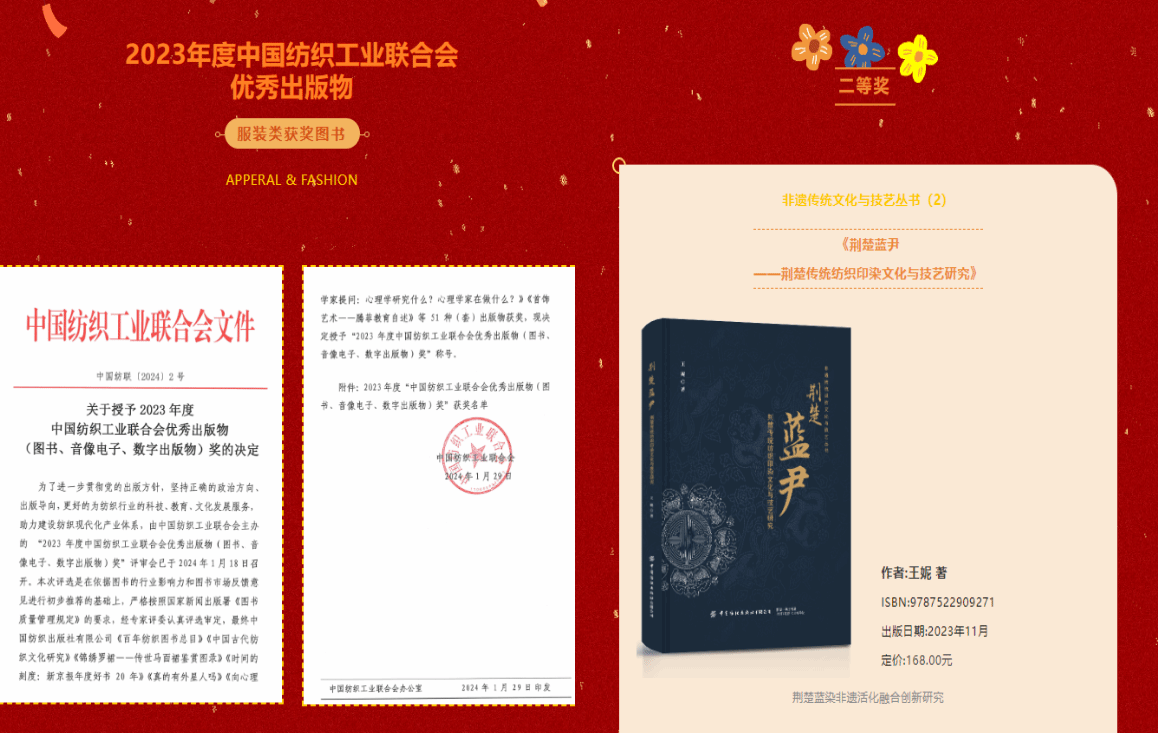 2024年1月29日中国纺织工业联合会(中国纺联[2024]2号)文件公布了“关于授予2023年度中国纺织工业联合优秀出版物(图书、音像电子、数字出版物)奖的决定。由国家一级出版社—中国纺织出版社有限公司出版的公司王妮副教授非遗著作《荆楚蓝尹—荆楚传统纺织印染文化与技艺研究》,被评为2023年度中国纺织工业联合会优秀出版物专业类二等奖。这是继2022年由湖北长江传媒数字出版有限公司出版的湖北省公益学术著作《唤醒蓝染千年之美—荆楚传统印染技艺探寻实录》又一力作。该著作一经正式出版,就在2023年12月12日“第二届湖北蓝染文化产业基地大会”中进行发布,并受到“湖北省人民政府官网“的新闻报道。同时,中国纺织出版社有限公司、中纺教学服务网、华师科技园非遗专栏等平台都进行图书推介。