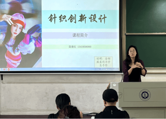 在针织创新设计方向宣讲环节,陈继红副教授就该方向的发展历程、行业需求、模块课程构成及优秀员工的职业发展进行了详细地介绍。该模块课程旨在熟悉针织工艺和技术的基础上,从训练思维的弹性推动针织创意样品设计的开发,探索针织材料的特征属性,并延展成从元素到形态到款式的设计逻辑推进能力;用实践实验过程验证设计的可能性和多样性,最终培养将概念转化落地的设计整合实操能力。