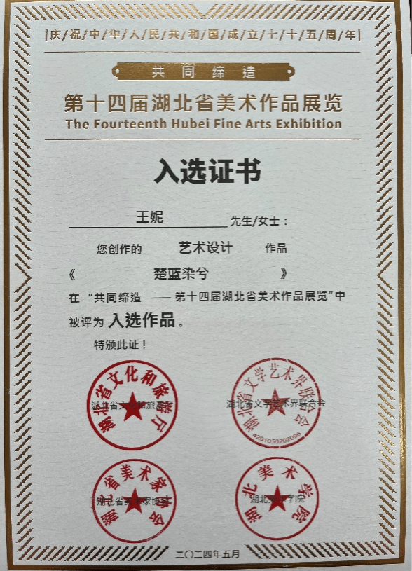 5月31日,由湖北省文化和旅游厅、湖北省文学艺术界联合会、湖北省美术家协会、湖北美术公司共同主办的“共同缔造——第十四届湖北省美术作品展览”落下帷幕。yl7703永利王妮副教授设计的非遗蓝染服装作品《楚蓝染兮》获评入选作品。本届美展全省入选的服装设计参展作品仅有四套,从作品立意到创作表达选拔都十分严格。王妮副教授此次能够入选,也是多年在非遗蓝染创新设计领域深耕的成果。