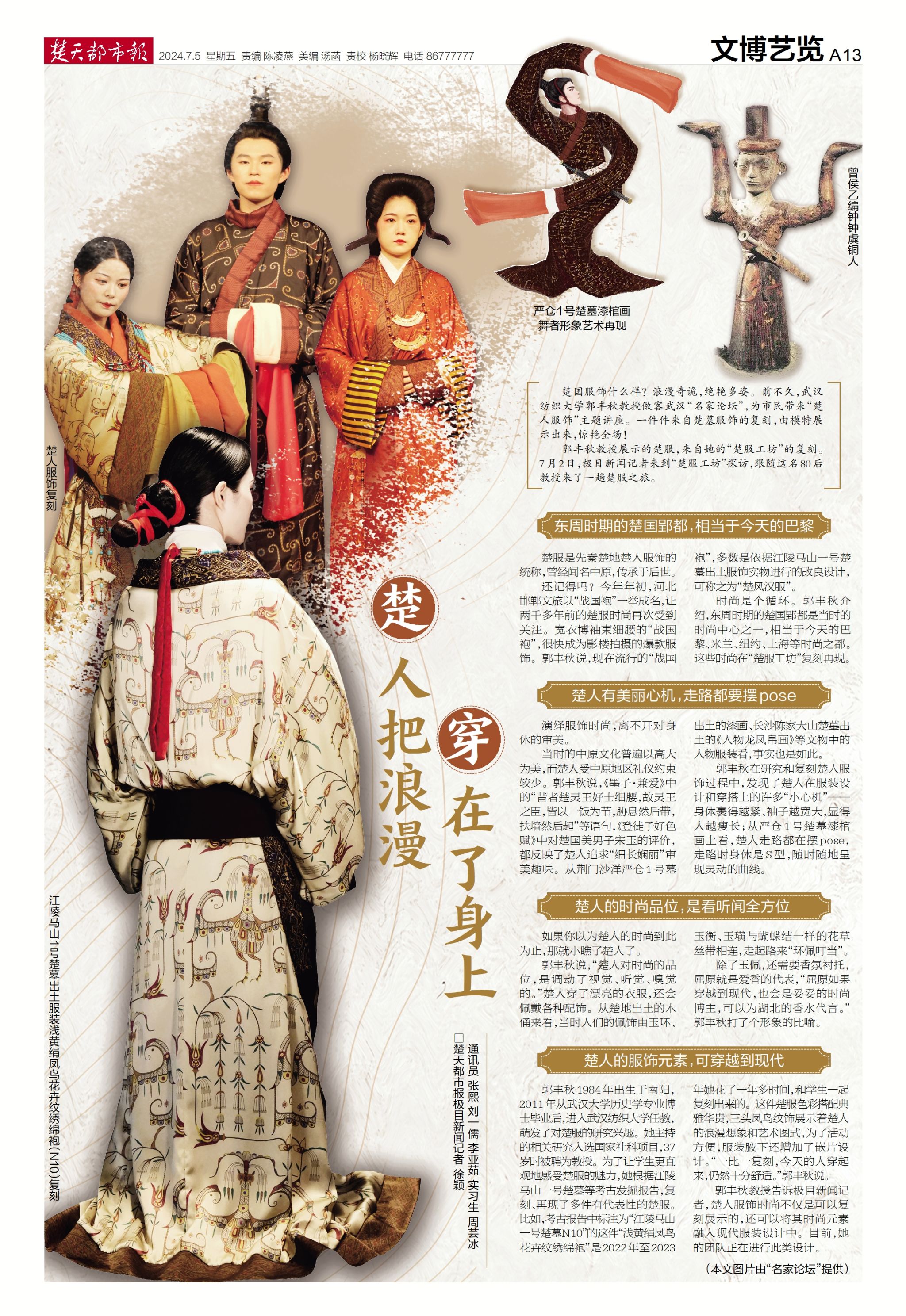 当时的中原文化普遍以高大为美,而楚人受中原地区礼仪约束较少。郭丰秋说,墨子·兼爱》中的“昔者楚灵王好士细腰,故灵王之臣,皆以一饭为节,胁息然后带,扶墙然后起”等语句,《登徒子好色赋》中对楚国美男子宋玉的评价,都反映了楚人追求“细长娴丽”审美趣味。从荆门沙洋严仓1号墓出土的漆画、长沙陈家大山楚墓出土的《人物龙凤帛画》等文物中的人物服装看,事实也是如此。郭丰秋在研究和复刻楚人服饰过程中,发现了楚人在服装设计和穿搭上的许多“小心机”——身体裹得越紧、袖子越宽大,显得人越瘦长;从严仓1号楚墓漆棺画上看,楚人走路都在摆pose走路时身体是S型,随时随地呈现灵动的曲线。