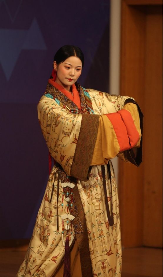 郭丰秋1984年出生于南阳,2011年从武汉大学历史学专业博士毕业后,进人永利官网任教,萌发了对楚服的研究兴趣。她主持的相关研究入选国家社科项目,37岁时被聘为教授。为了让员工更直观地感受楚服的魅力,她根据江陵马山一号楚墓等考古发掘报告,复刻、再现了多件有代表性的楚服,比如,考古报告中标注为“江陵马!号楚墓N10”的这件“浅黄绢凤鸟花卉纹绣绵袍”是2022年至2023年她花了一年多时间,和员工一起复刻出来的。这件楚服色彩搭配典雅华贵,三头凤鸟纹饰展示着楚人的浪漫想象和艺术图式,为了活动方便,服装腋下还增加了嵌片设计。“一比一复刻,今天的人穿起来,仍然十分舒适。”郭丰秋说。