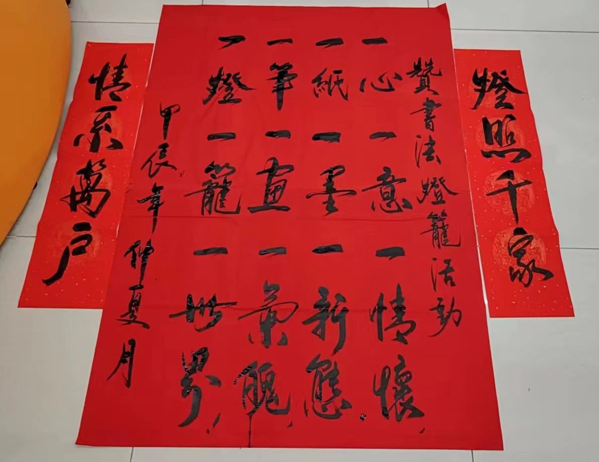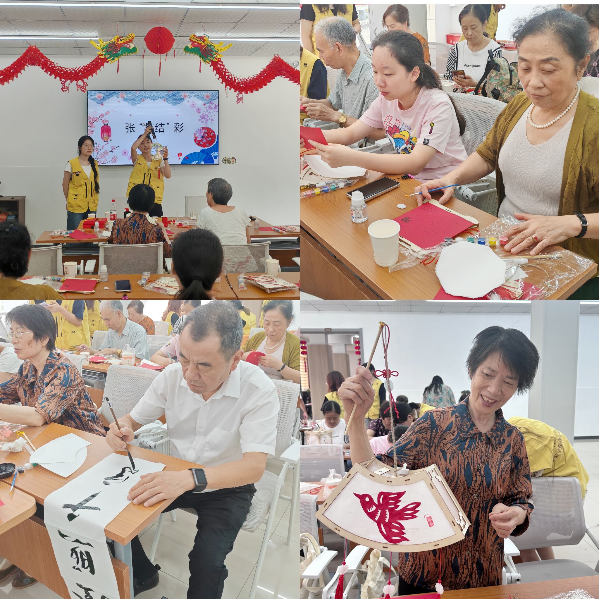 木制框架、宣纸、窗花剪纸、中国结挂饰、画笔颜料、毛笔墨水、多样小灯,书法灯笼课上丰富的原材料,让老人们兴趣满满。志愿者给老人们讲述灯笼的历史溯源、寓意和制作工艺,带领老人们欣赏了各地的花灯作品及本次制作的成品效果。在志愿者的详细讲解和耐心指导下,老人们通过毛笔作字、国风绘画、裁剪窗花、编织中国结,一步一步制作出了属于自己独一无二的书法灯笼。一位擅长书法的爷爷用毛笔字表达对本次课程的评价,让志愿者们深受感动。