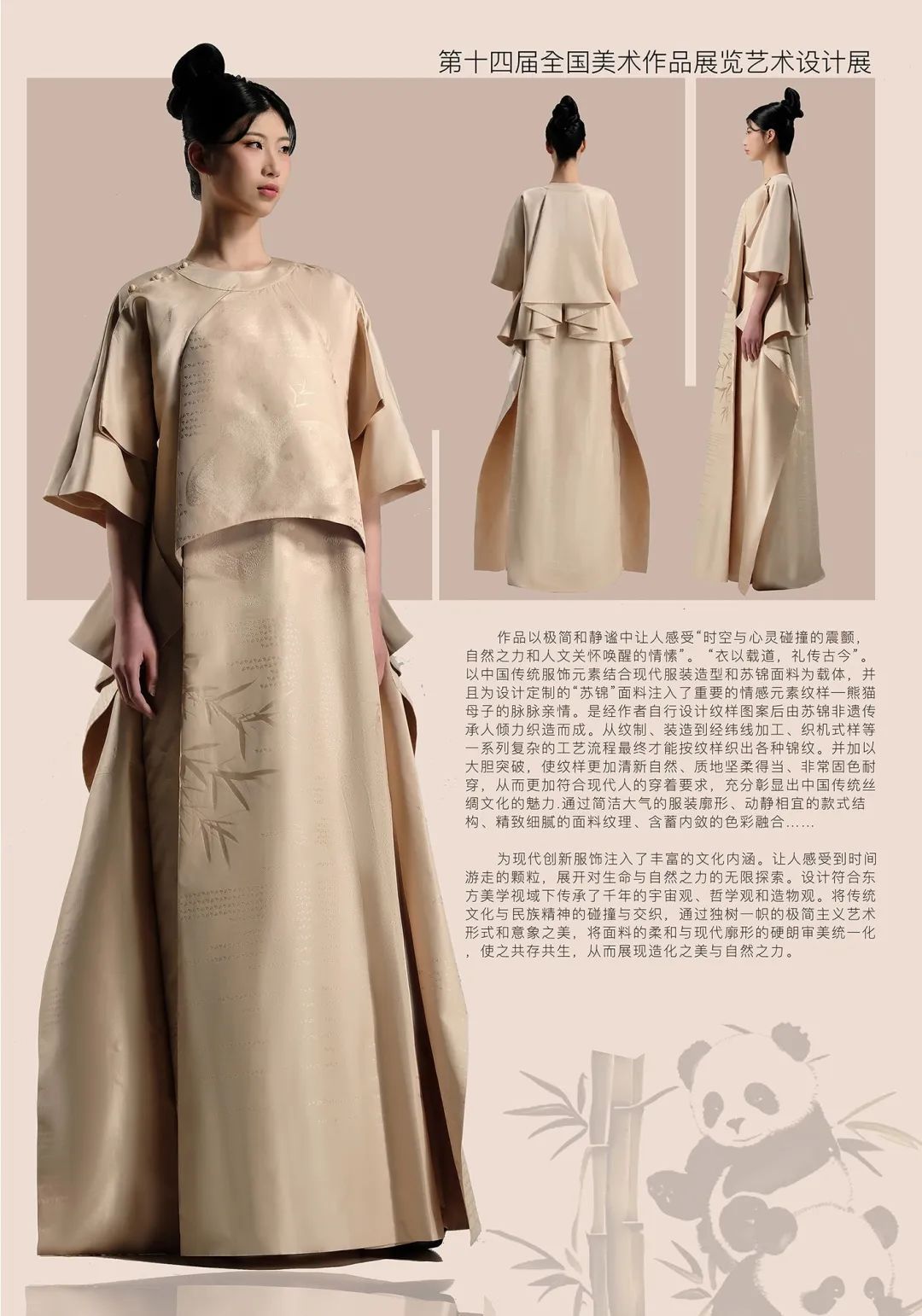 衣以载道,礼传古今。作品设计以中国传统服饰元素结合现代服装造型,以苏锦面料为载体,并且为设计定制的“苏锦”面料注入了重要的情感元素纹样——熊猫母子的脉脉亲情。通过简洁大气的服装廓形、动静相宜的款式结构、精致细腻的面料纹理、含蓄内敛的色彩融合……为现代创新服饰注入了丰富的文化内涵。让人感受到时间游走的颗粒,展开对生命与自然之力的无限探索。