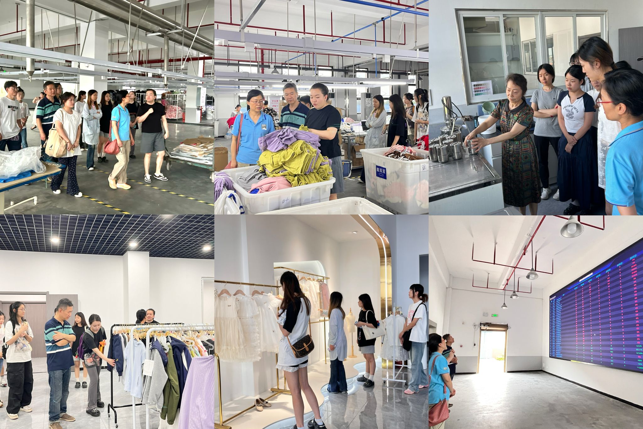 在了解服装设计与制作的基础上,天大印染负责人肖雷和蓝天物流负责人尹红梅带领同学们进一步了解企业的上下游生产环节以及一系列精细化革新和专门化加工工艺,感受企业运作模式。在现场沉浸式的学习过程中,同学们均收获颇丰,不仅拓宽了视野,更对服饰产业的运作有了更为全面而深刻的理解。