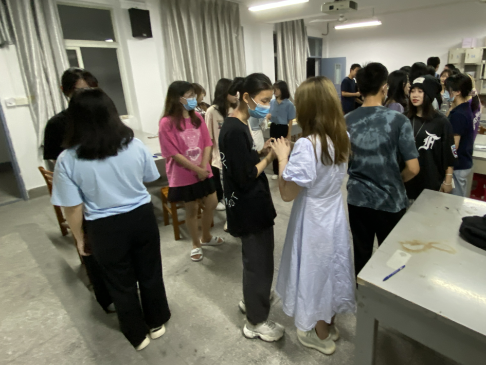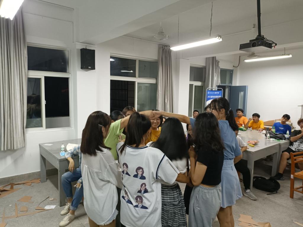 在各班班助的带领下,“相识接龙”、“心有千千结”、“我想有个家”等团辅活动依次进行。从陌生拘谨到欢声笑语一片,有趣的活动逐渐拉近了同学心与心的距离。“相识接龙”过程中,不少同学为记住前后左右的人员绞尽脑汁,也有不少同学因记错名字而接受“惩罚”。在进行“我想有个家”时,每位同学更是全情投入,现场欢声笑语不断,场面十分热闹。在“心有千千结”活动中,同学们相互合作,齐心协力成功打开“结”。活动最后,大家在小卡片上写上自己对大学四年的憧憬与展望,并彼此交换这张“心语心愿”卡片。