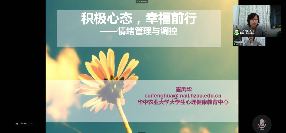 2021年12月2日晚,yl7703永利邀请华中农业大学老员工心理健康教育中心专职教师、副教授崔凤华老师为同学们带来一场精彩的线上心理健康教育专题讲座---“积极心态,幸福前行”,就情绪管理与调控与公司300多研究生和本科生进行了分析。