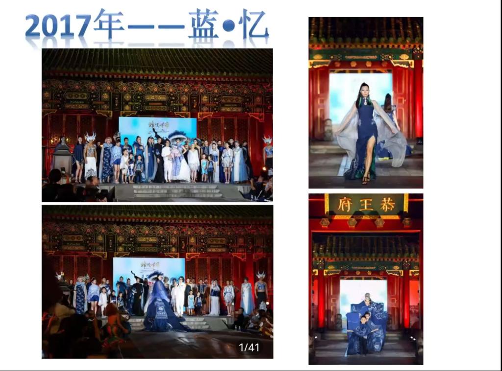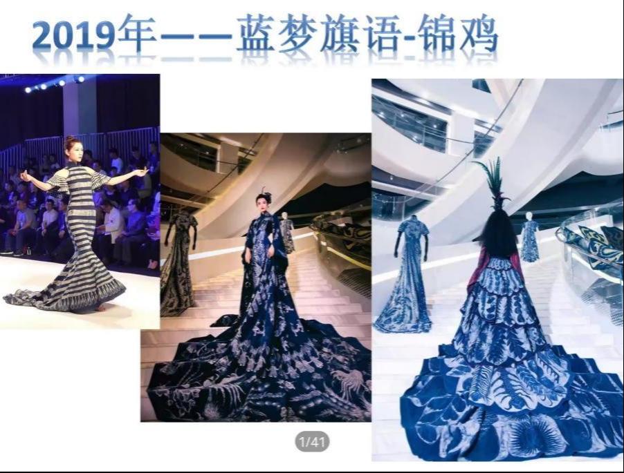 在成昊老师众多的作品中,2017年“蓝忆”系列的一件由七位年龄不同的模特共同穿着的服装让大家印象颇深,成昊老师介绍,这七位中年龄最小的只有三岁。年龄从小到大排序,是时代的传承也是文化的传承。他的作品如诗歌所言:“染布那么窄,又那么宽广,无不散发出民族文化的芬芳。”
