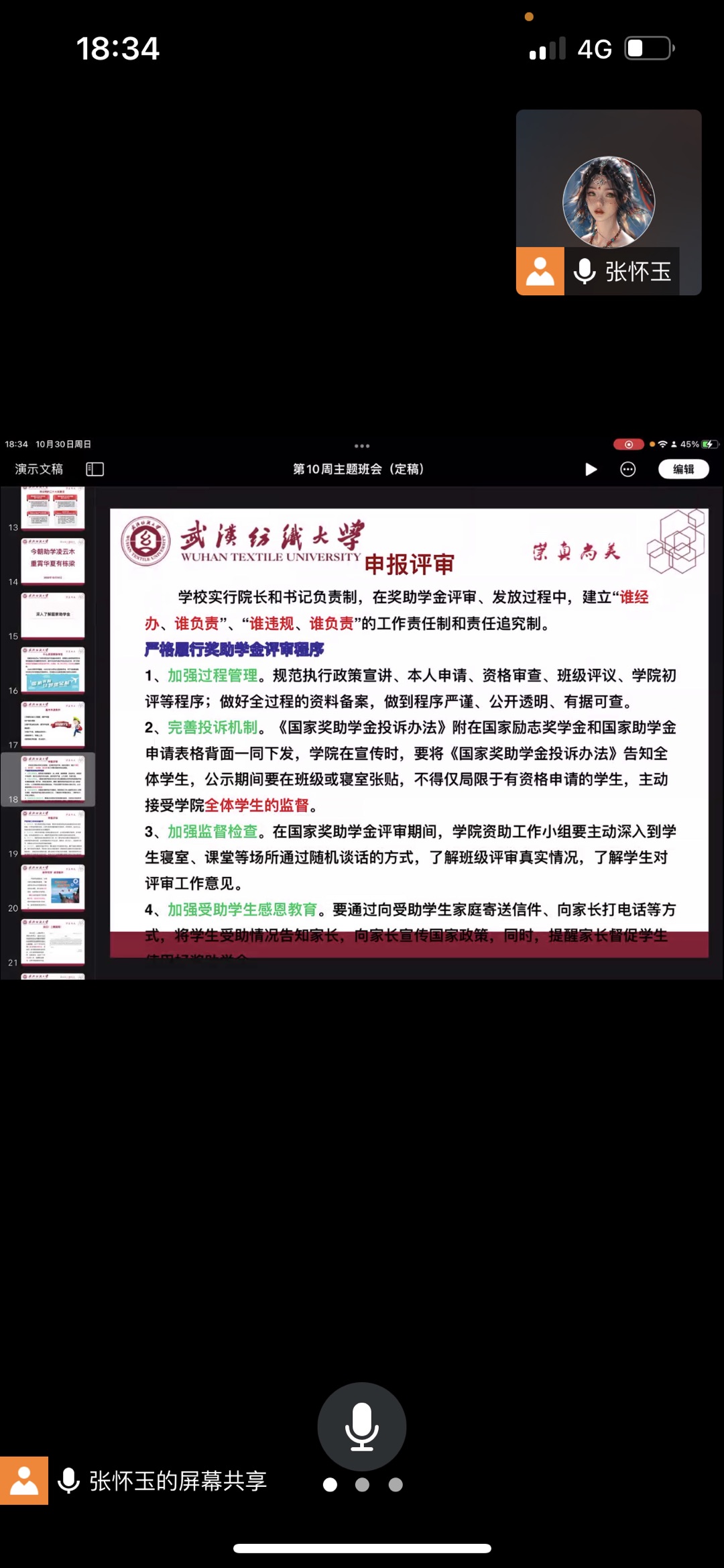 接着,各年级辅导员进行了国家励志奖学金、国家助学金、校奖学金等奖助学金的政策宣讲工作,对此次奖助学金评选的项目、评审工作程序、时间要求、网络填报填写、纸质材料准备等相关要求进行了详细说明,并宣读了《国家奖助学金投诉办法》;辅导员老师们带领各班级详细了解奖助学金本人申请、资格审查、班级评议等程序过程,以及各个环节的政策要求;带领各班级一起学习《永利官网员工手册》中的相关制度,确保所有员工都能清楚各类奖助学金的评审条件、评审程序、投诉办法、保密相关规定等。于此同时,辅导员老师们引导教育员工常怀感恩之心,常为感恩之行。