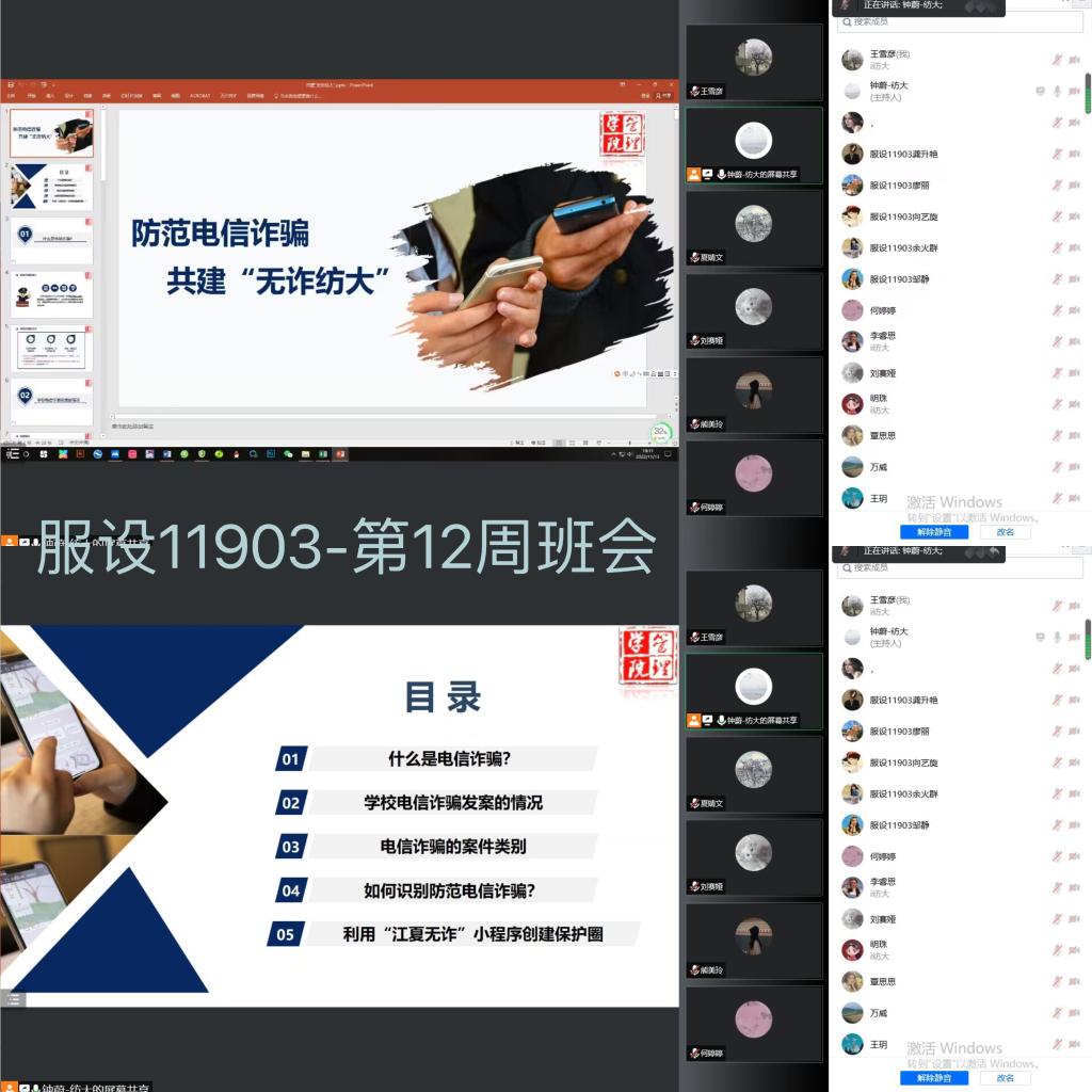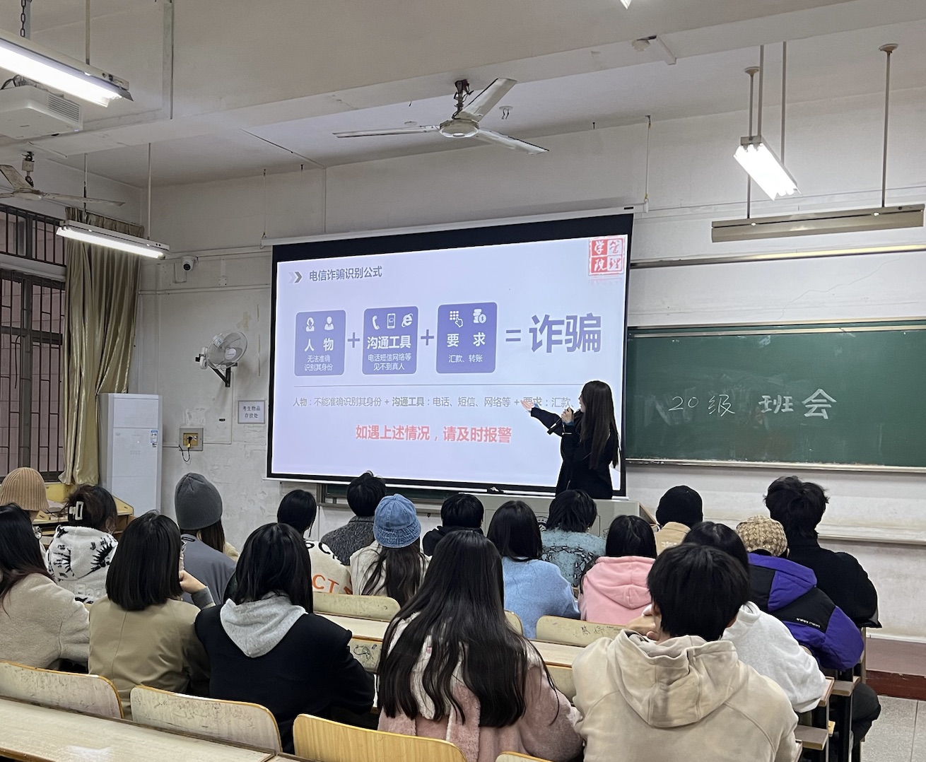 11月13日晚,yl7703永利召开了晚点名主题班会,各年级辅导员、班主任以“防范电信诈骗 共建无诈纺大”为主题,开展全覆盖式的“防范电信诈骗”主题班会,教育同学们进一步加强安全防范意识,预防电信诈骗,共建“无诈纺大”,会后,各年级组织同学们签订了防范电信诈骗承诺书。