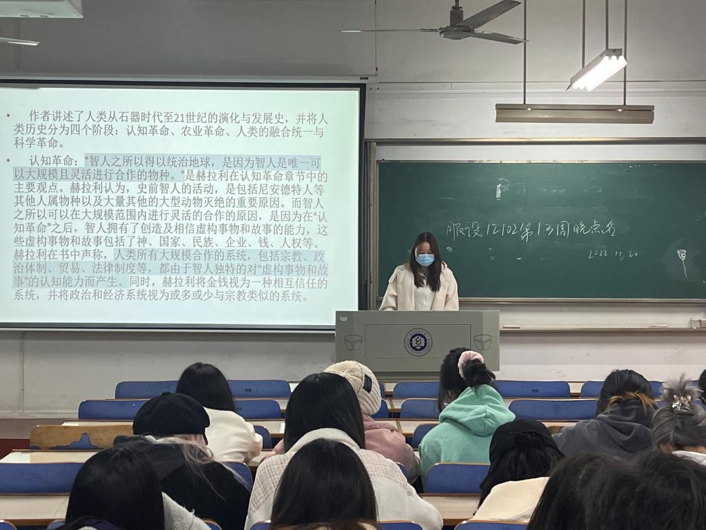 服设12102班的罗沁怡分享了书籍《人类简史》,人类的上帝身份只是虚构出来的,人类区别于其他事务的原因就是思想。以作者的视角,跳脱出人类这个群体,仿若高维生物审视人类的一切,冷静也不乏温情,试着在“史书”中讨论个体幸福的人。