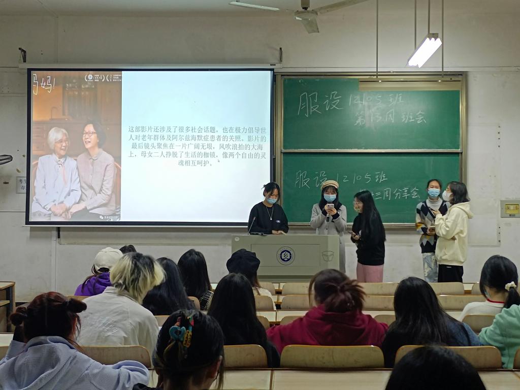 服设12105班的童徐瑞,方慧堃,夏云茜,蒋雨桐,陈菲扬五位同学共同分享的电影是《妈妈》。这部影片聚焦到了很多社会话题,也在极力倡导世人对老年群体及阿尔兹海默症患者的关照,引发同学们深思。