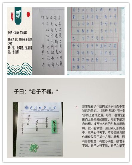 第三组同学分享的内容丰富多彩,其中不仅有硬笔书法,还有软笔书法与刻字,让人眼前一亮,记忆深刻。龚其妍同学采用了刻字的形式,将“君子不器”四字展现在我们眼前,说到君子不应该拘泥于手段而不思考其背后的目的,引人深思。