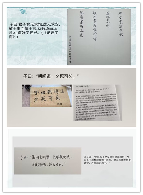 第一组同学分享的都是硬笔书法作品,文字书写工整清晰。其中崔楚豫同学向大家讲解了好学之道;付芷璘同学讲到人需要讲诚信,教导百姓,不能光靠刑法约束,用道德教化百姓,他们才会怀廉耻之心,做遵纪守法的人;朱婷同学仔细分析了“礼之用,和为贵”中和谐的重要性。