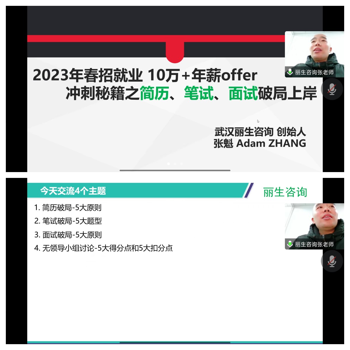 1月16日晚7点,yl7703永利“考研后,赋能加油站”活动第三场,武汉丽生咨询创始人张魁老师以“如何冲刺2023年春招就业”为主题,给同学门详细讲解了如何撰写优秀简历,以及笔试、面试和无领导小组讨论技巧。