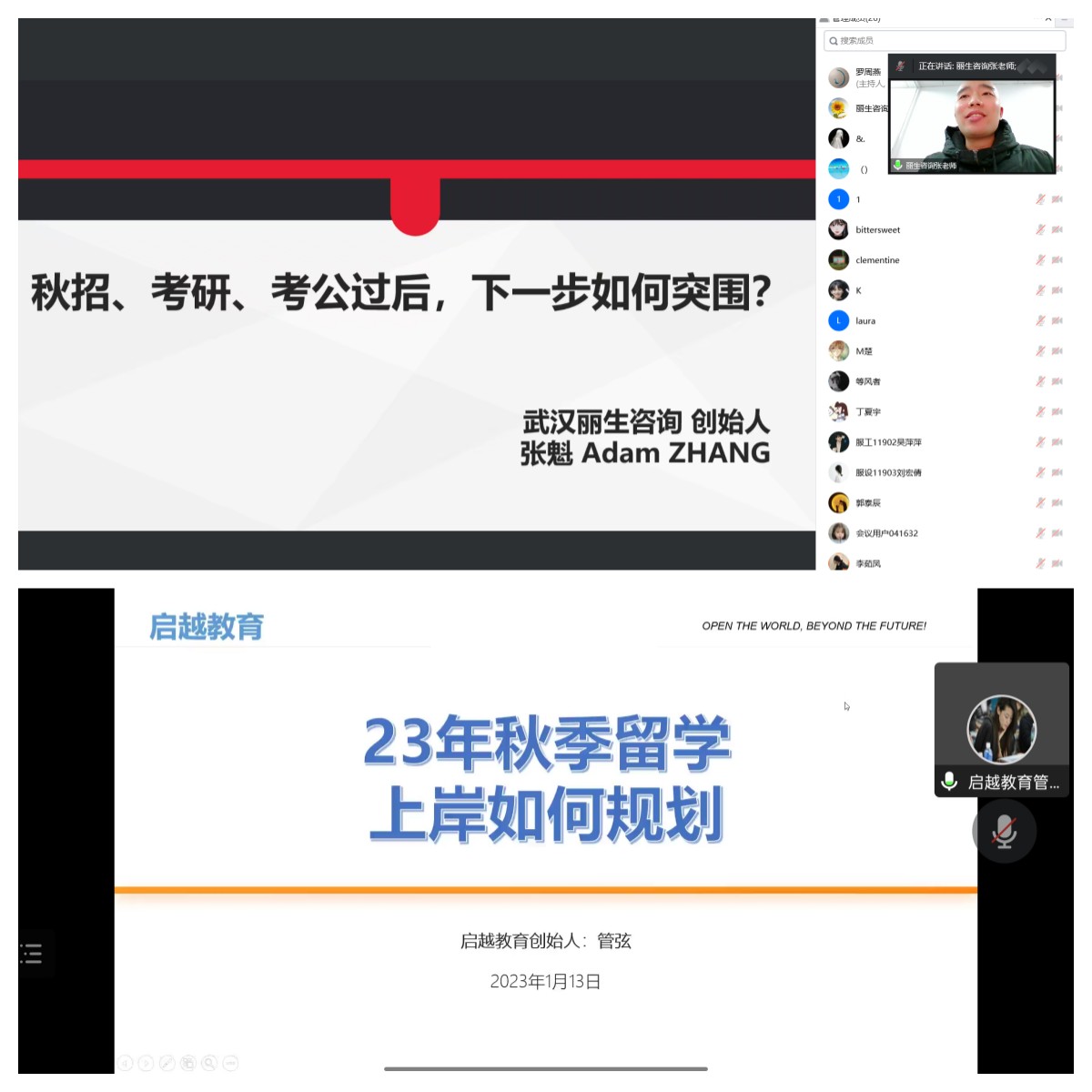 1月13日晚7点,yl7703永利“考研后,赋能加油站”活动拉开序幕。活动第一场,武汉丽生咨询创始人、原新东方教育科技集团高管张魁老师以“秋招、考研、考公过后,下一步如何突围?”为主题,向同学们讲解如何根据自己具体情况,对接下来是继续考研、考公、留学,还是就业或者创业等进行决策选择。启思越见教育创始人管弦老师以“23年秋季留学上岸规划”为主题,通过对比各留学国家和专业选择路径,向大家介绍了如何拿下国外集团2023年秋季录取上岸机会。