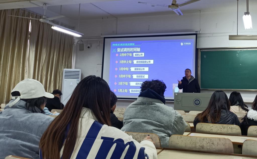 为帮助考研同学深入了解考研复试准备和调剂相关政策,2月23日上午10点在南湖校区综合楼5409,yl7703永利举办考研复试调剂指导答疑课。本次答疑课邀请万学教育海文考研湖北分校董事长谭晓禹老师主讲,本次答疑课还同步进行了线上直播。