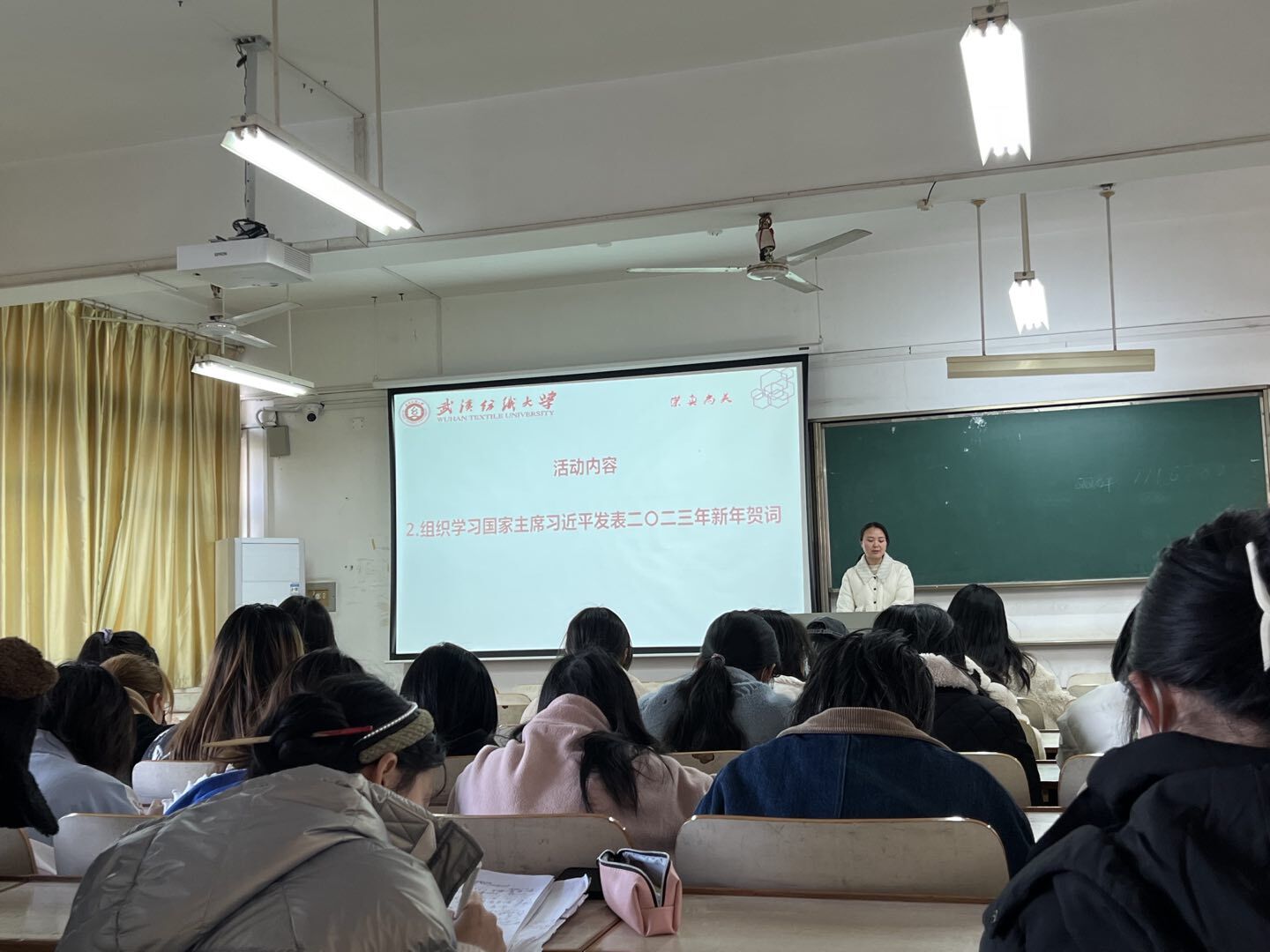 活动中,各团支部认真学习了习近平2022年10月16日在中国共产党第二十次全国代表大会上的报告中科技创新的内容,组织学习了国家主席习近平发表二〇二三年新年贺词,组织学习了《关于组织开展第十八届“挑战杯”全国老员工课外学术科技作品竞赛的通知(中青明电【2023】6号)》,yl7703永利团委书记黄鹤传达了共青团湖北省第十五次代表大会精神,勉励全体服装团员青年要深学笃行习近平新时代中国特色社会主义思想,全面学习贯彻落实党的二十大精神,勇担重任、拼搏进取,让青春在湖北建设全国构建新发展格局先行区中绽放绚丽之花。