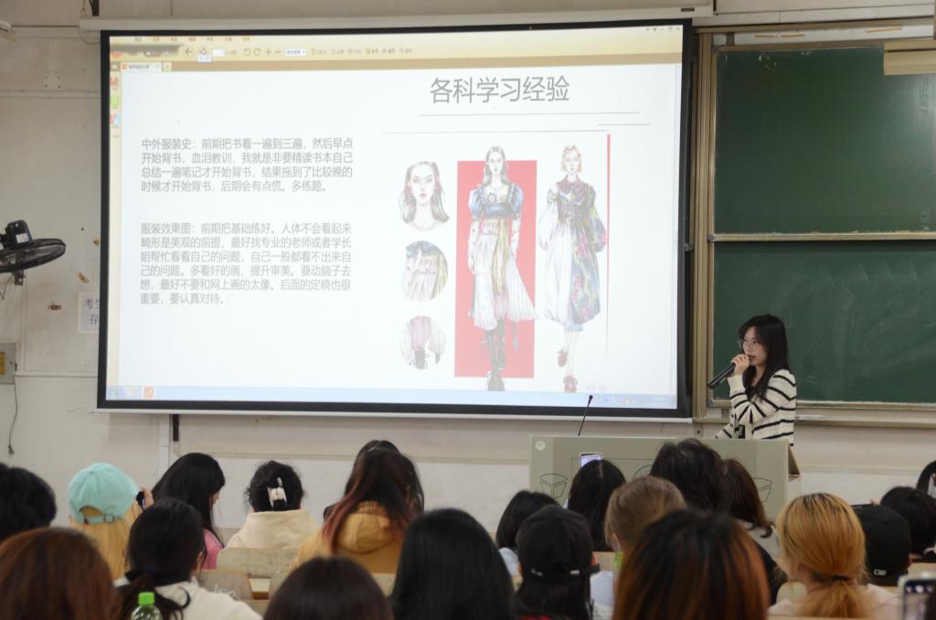 为了让大家明确考研目标,掌握相关考研经验,帮助下一届同学更好的复习备考,服装公司于2023年5月11日下午14点在尚知楼109教室举办了服设专业考研经验交流分享会。分享会上,5位成功“上岸”研究生的学姐——工业制版11901班朱翠云、服工11902班韩佳敏、服设(中外)11902班曹冰茨和针织11901班蒋礼香逐一作了备考经验的分享。公司有意向考研的100余名员工参加了本次分享会。