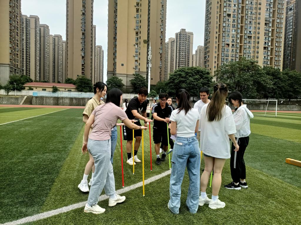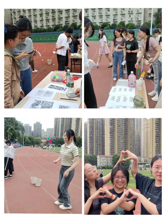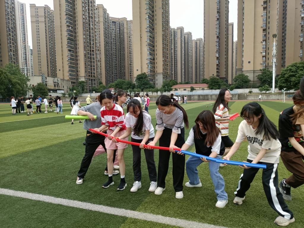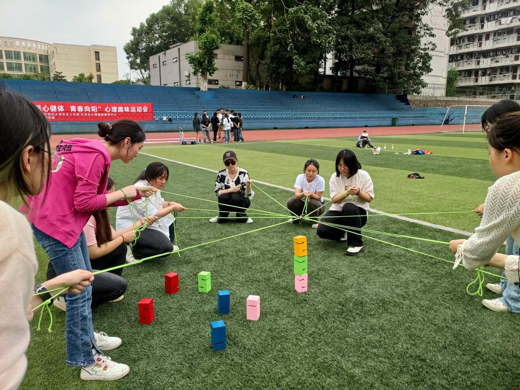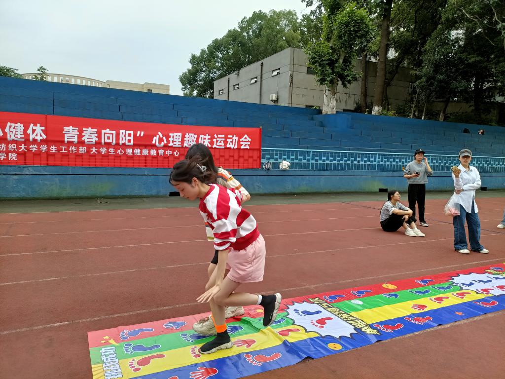 本次心理趣味运动会设有”珠行万里”、“不倒森林”、“手脚并用”、“合力搭塔”和“同心击鼓”等团体项目,同时还有“心理知识问答”、“看拼音说词语”、“社牛挑战”、“投壶”、“母鸡下蛋”、“踢毽子”等有趣的个人项目。活动现场气氛热烈,大家参与热情极高,每一场比赛每一个活动项目都充满了同学们的欢声笑语。