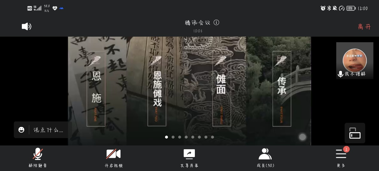 在为时近一小时的讲座中,张淑媛同学结合专业实际,作了傩文化知识讲解。她从“傩”字开讲,介绍了傩的起源、内涵、类型、主要表现形式等,并利用线上幻灯片展示了恩施傩文化的主要四种类型即生、旦、净、丑四行的面具,以及恩施傩文化博物馆的陈列布展、建设发展、藏品收藏情况。主要有傩仪、傩戏、傩祭与傩技四种表现形式,是我国民族传统文化的瑰宝。