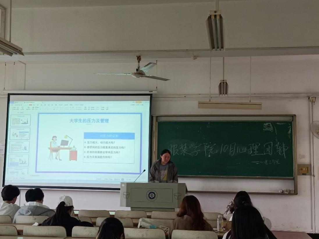 首先,心理工作站咨询部成员通过心理压力测试题来调动现场气氛,让同学们直面压力问题,并对压力问题进行分析,主要来源有学业、人际、突发事件以及就业发展。