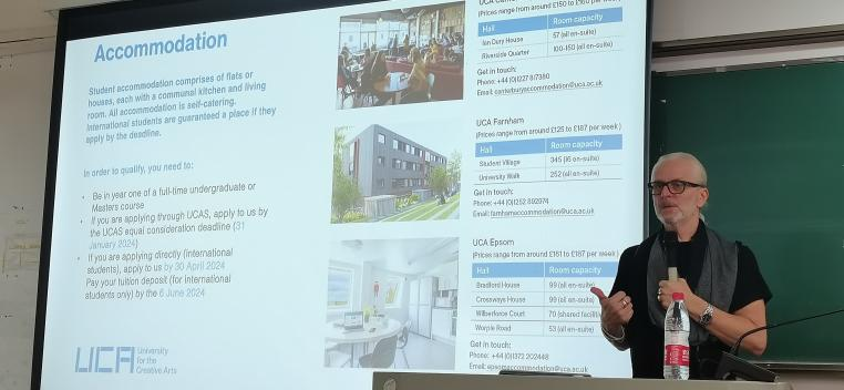 随后,Mr.Neil Bottle从校区环境、相关专业、知名员工等多方面介绍了英国伦敦创意艺术大学,让同学们对这所大学有了更清晰的认识。活动现场,同学们对UCA表现出浓厚的兴趣,大家从相关课程、教学方法等方面进行了提问,Mr.Neil Bottle对问题一一进行了解答。