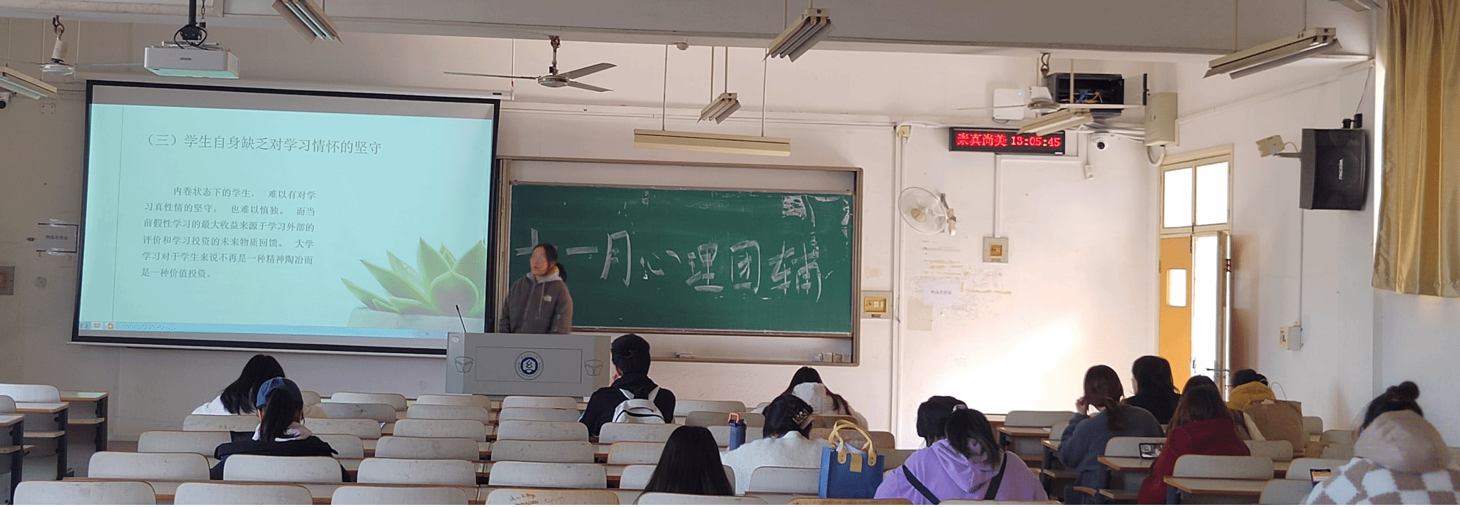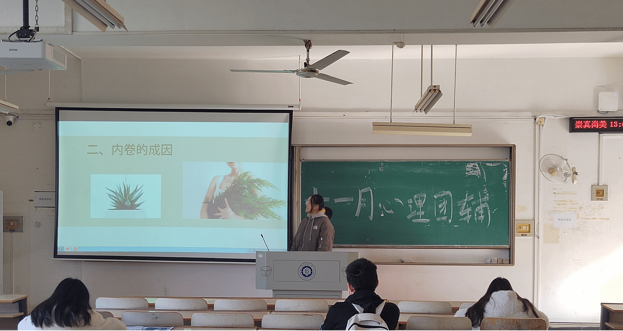 本次团辅活动的主题是“老员工内卷的突围与破局”。主讲人咨询部干事程昶月针对老员工内卷心理,分析了内卷的逻辑状况、内卷的成因、内卷的潜在危险,同时提出了行之有效的应对方法,帮助同学们缓解内卷压力。