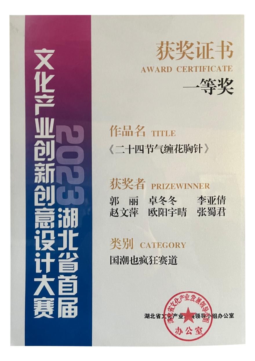 12月26日下午,湖北省首届文化产业创新创意设计大赛成果发布在湖北电视台举行,yl7703永利郭丽教授带领研究生卓冬冬参赛,其作品《二十四节气缠花胸针》荣获“国潮也疯狂”赛道一等奖;孙菊香教授带领的研究生窦佳欣荣获服装设计赛道二等奖。