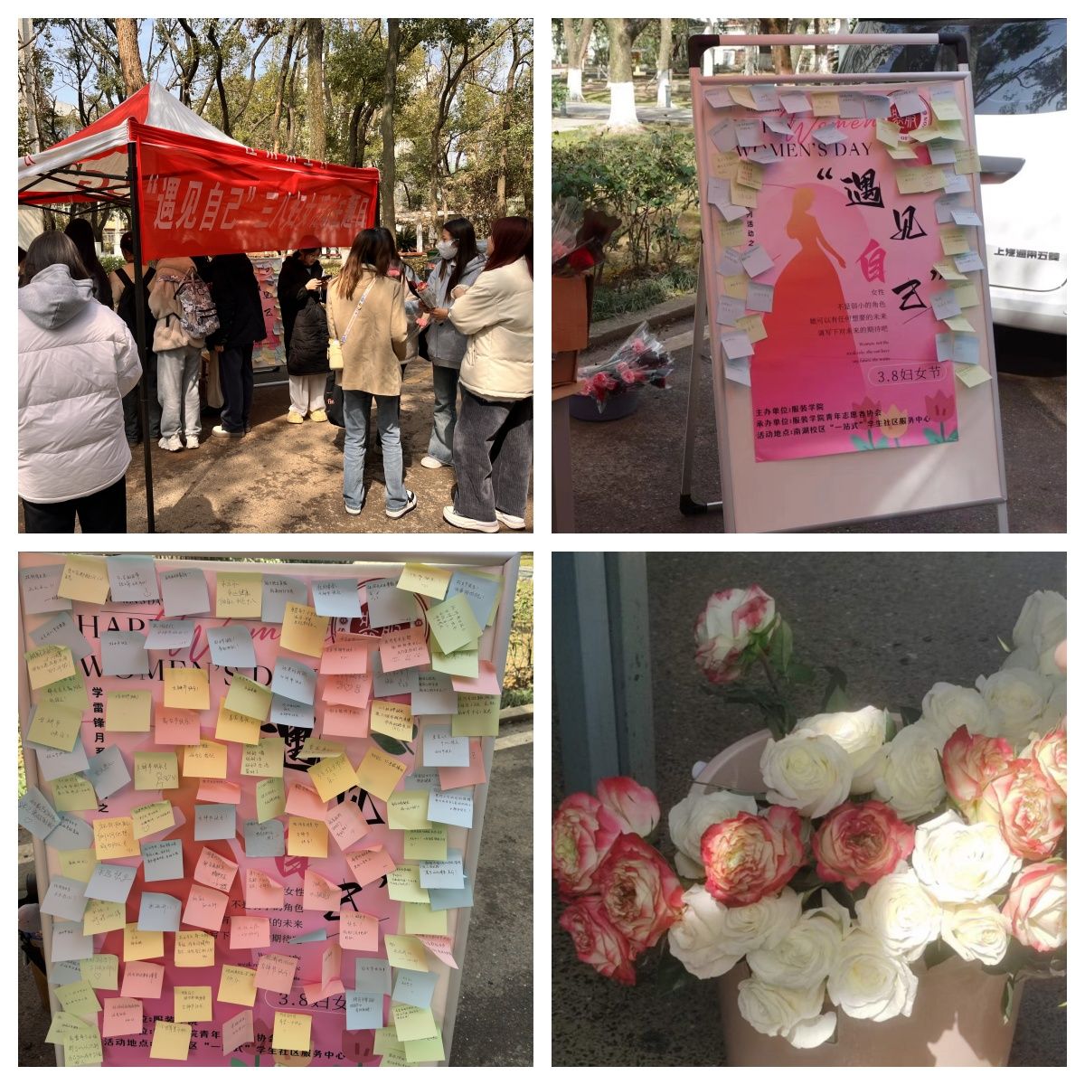在南湖校区,公司青年志愿者协会组织了“遇见自己”系列活动。活动包含卡片填写和鲜花自助,希望女生们通过给自己写一段话,表达遇见自己,认识自己,接纳自我的美好寓意。同时,每一名填写祝福的同学都会获得一份鲜花,希望他们在美丽的鲜花中感受到美的力量。