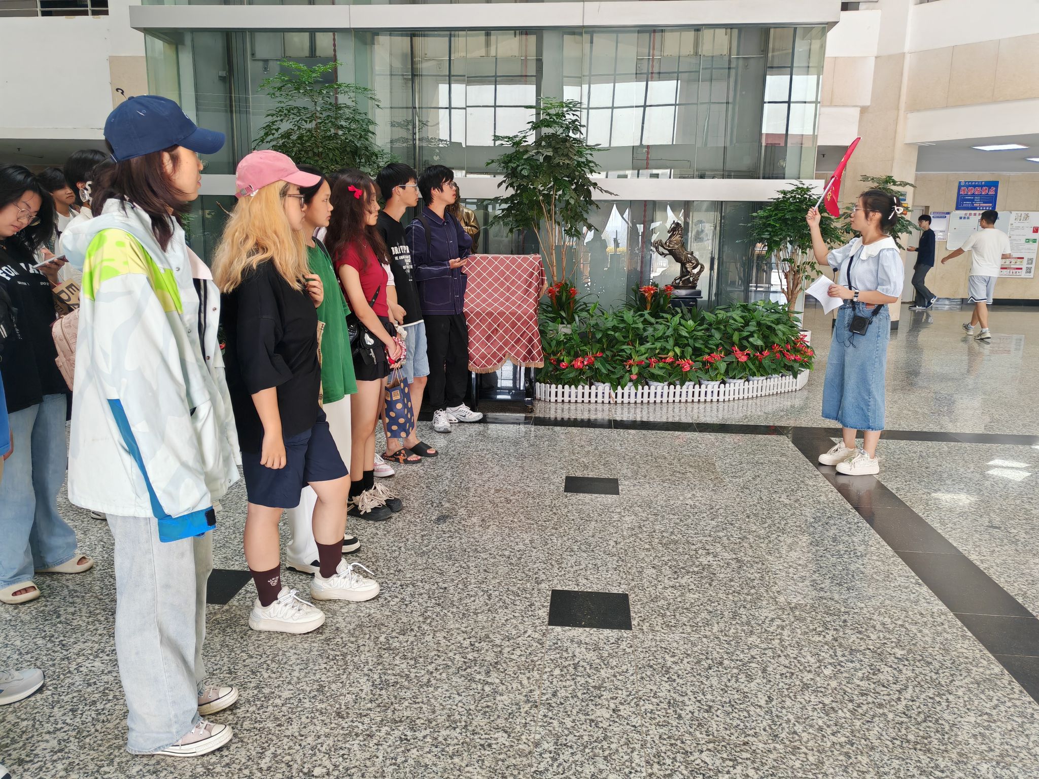 与此同时,在南湖校区的非遗馆,新生们通过专业讲解员的引导,详细了解了古代纺织工艺“织”、“染”、“绣”的历史发展脉络及其深厚的文化内涵。他们不仅观赏到了珍贵的非遗纺织品,还近距离接触到了土家织锦、大悟织锦带、天门蓝印染等具有浓郁地方特色的纺织技艺。此外,纺大非遗社团的学长学姐还现场展示了精湛的汉绣技艺,用他们结合专业设计制作的汉绣文创产品,进一步激发新生对传统文化的兴趣和热爱。