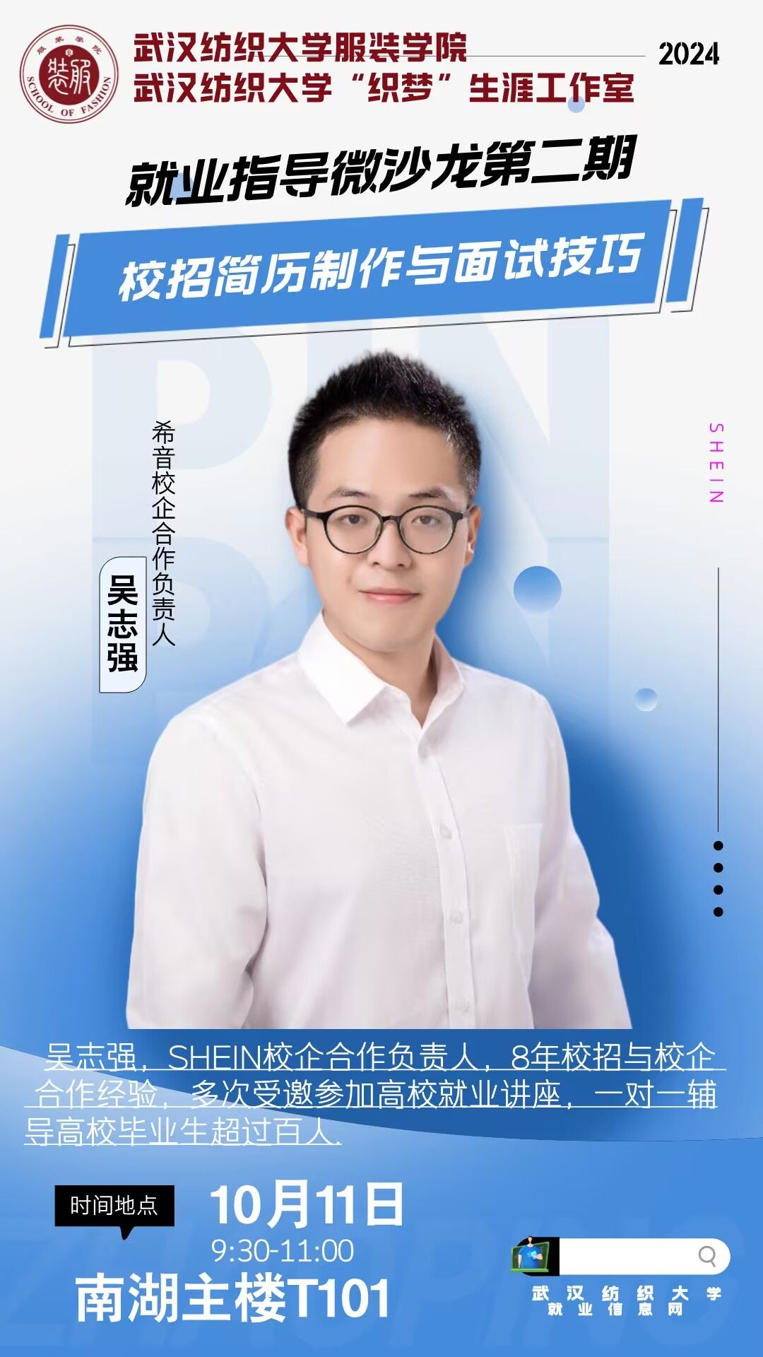 为扎实推进就业工作,促进员工与企业的双向选择,加强“织梦生涯工作室”建设,加深公司与企业间的合作,公司开展了优质企业进校园系列就业活动,10月11日上午,yl7703永利SHEIN校企合作负责人吴志强走进校园,在南湖一站式员工社区中心T101面向服装公司毕业生开展就业指导微沙龙,公司党委副书记郭泰辰、21级毕业生辅导员高梓超以及一百多名毕业生参加活动。